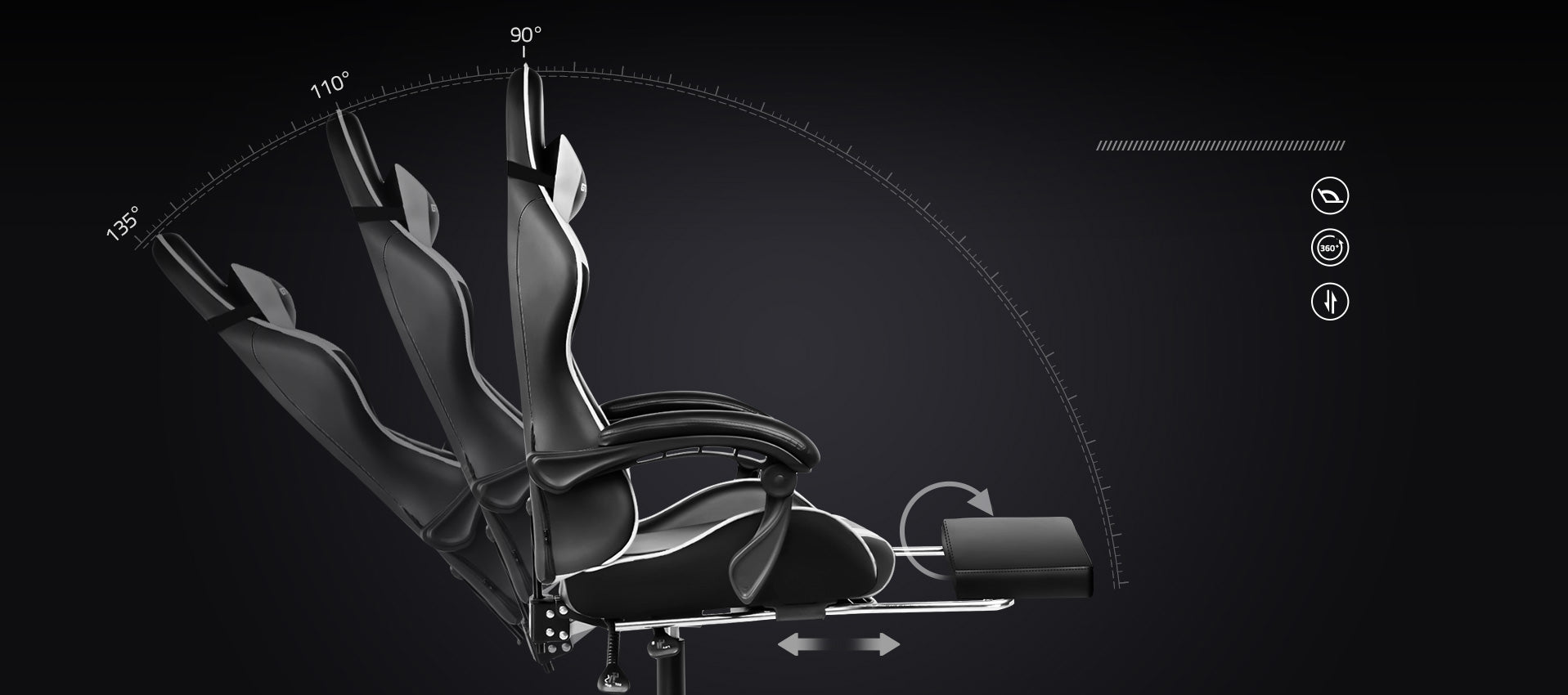 - Enjoy adjustable recline (90°-135°) and a retractable footrest for ultimate comfort whether gaming, working, or relaxing.